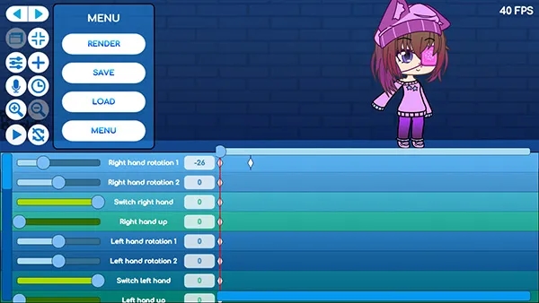 6、上方操作完成之后即可进入动画编辑界面,左下方为角色动作区域,通过文字左侧的滑钮即可调整上方角色的动作,与姿势编辑类似,而右侧则是时间轴,例如我们调整了右手移动,同时在右侧时间轴中创建一个新的区域的话,那么右手就会在该时间内移动