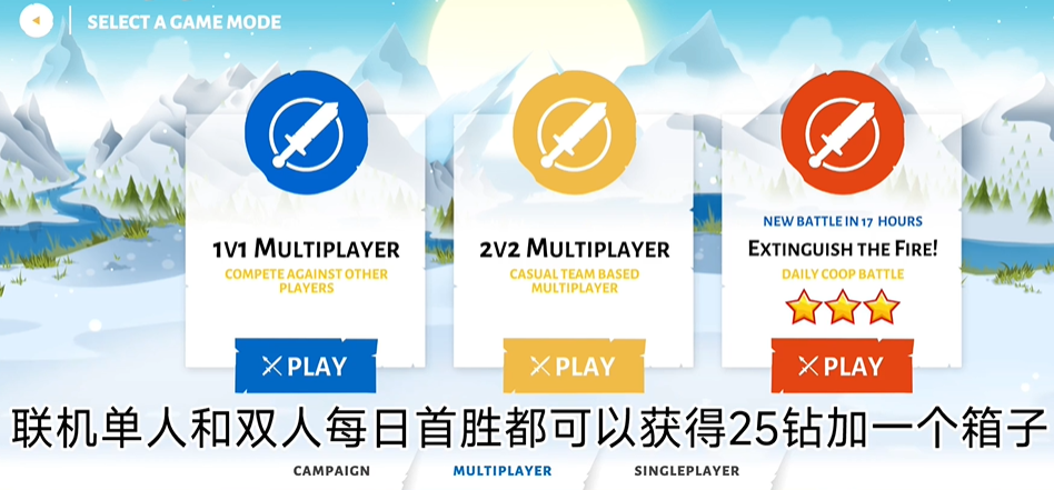 2、下面有三栏,分别为战役、联机、单机。联机单人和双人每日首胜都可以获得25钻+1个箱子