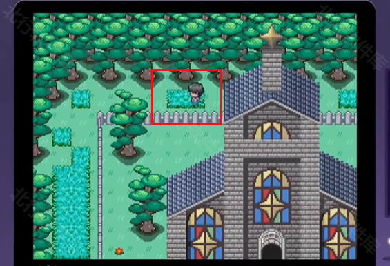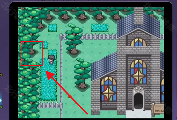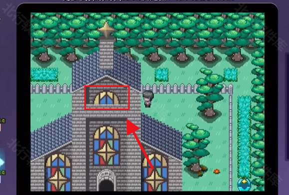 1、第一只我们先要前往【教堂】,不要进入教堂,直接来到教堂后面。如图所示,这里有一块被教堂顶部遮住的区域