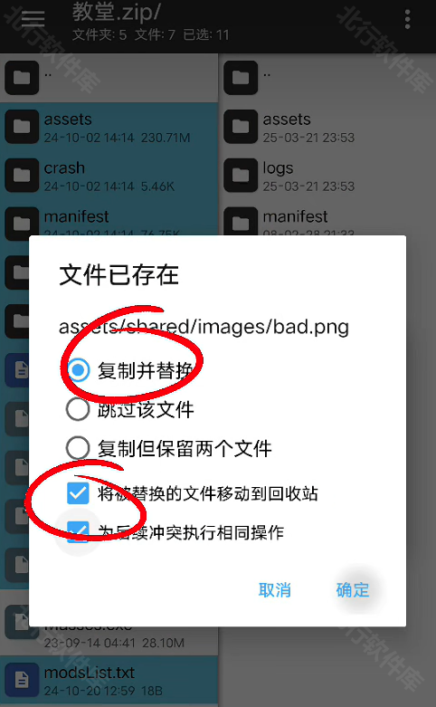 8、如果出现了如下图所示的弹窗体型,选择“复制并替换”,勾选“将被替换的文件移动到回收站”和“为后续冲突执行相同操作”
