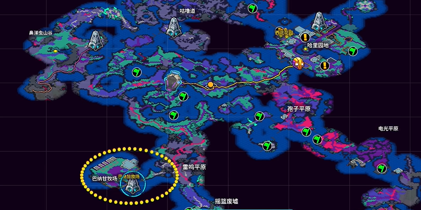2、巴纳甘牧场在地图左下角,雷鸣平原左侧,如果已经开了传送点可以直接传送过去,没开的话也能走过去