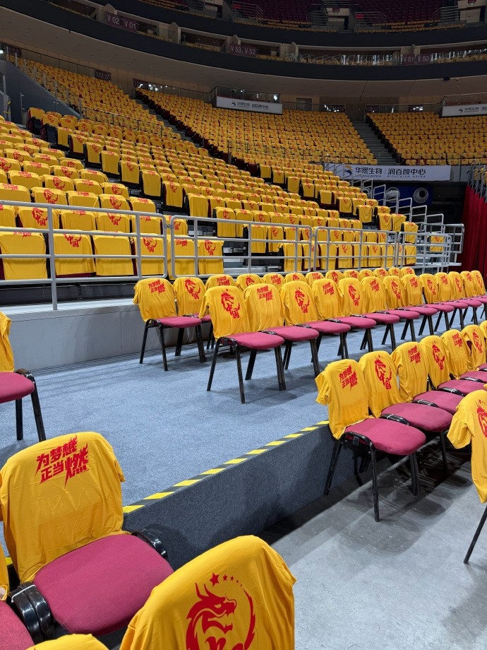 气氛到位了!五棵松看台铺满“为梦想,正当燃”助威T恤