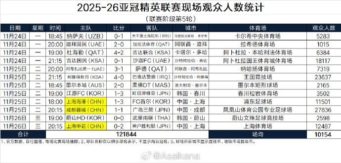 直播吧11月28日讯 亚冠精英联赛第五轮结束争夺,上座人数方面,蓉城主场近2.8万人居首,海港、申花主场超1万人。