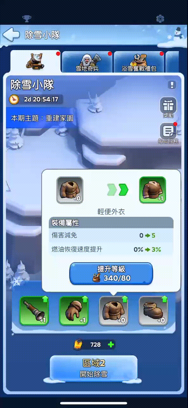 2、相对应的会有除雪装备升级(类似英雄装备,主要用来增加铲雪的效率)-除雪背包(道具存放)