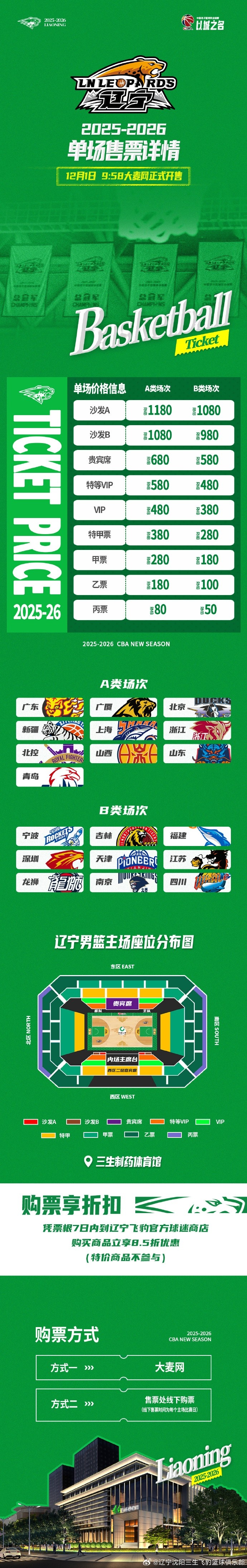2025-2026赛季CBA常规赛即将于12月12日拉开帷幕,辽宁本钢队的首个主场比赛是12月15日迎战卫冕冠军浙江广厦队。辽宁本钢队常规赛主场门票(单场票)将于12月1日上午9点58分开售。