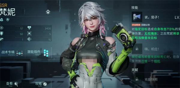 在游戏内是一个远程输出角色,能量储备完成后,可以召唤机枪对敌方进行扫射,同时整体暴击率极高,能够持续性输出。