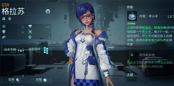 是游戏内的工程型输出角色,同时兼备召唤组装的技能,在配备了“坏小子”机器人后,可以对最近的敌人单位造成自爆伤害,该伤害为真实伤害,且基于自身攻击倍率236%进行数值转化。