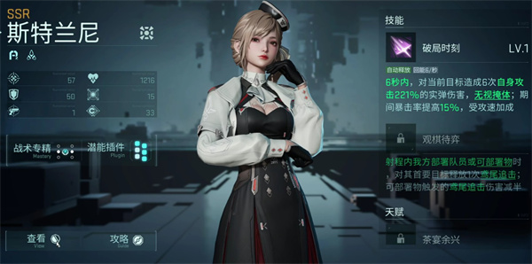 在游戏当中,可以对当前目标造成一次基于自身攻击倍率为221%的真实伤害,同时无视掩体,期间暴击率还会提升15%,是一个攻速流的输出型角色。