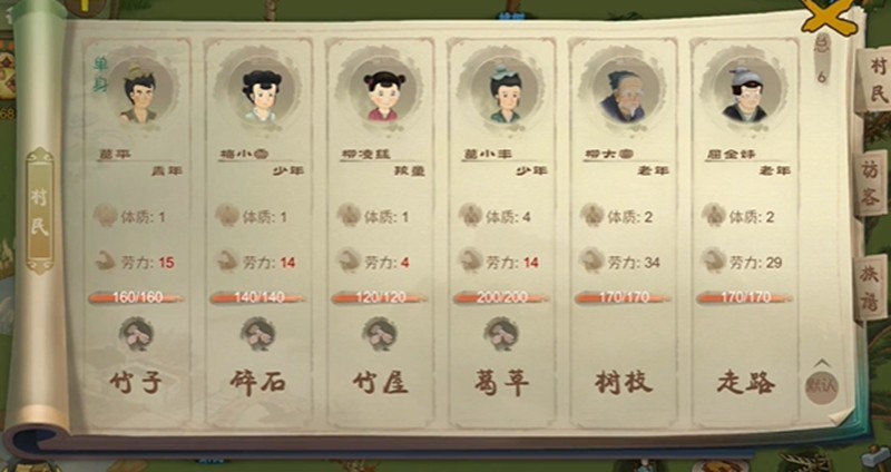选择合适的村民是提高采集效率的关键。每位村民拥有15点初始劳动值,劳动值越高,单次采集的资源量越多。刘长英和柳大富是初期推荐的采集人选,他们的属性偏向体力与劳动效率,适合承担砍树这类重复性较高的任务。在派遣时,点击村民头像,选择“采集”指令并指定树木资源点,确认后村民便会前往工作。劳动值会随着采集消耗,归零后需休息恢复。