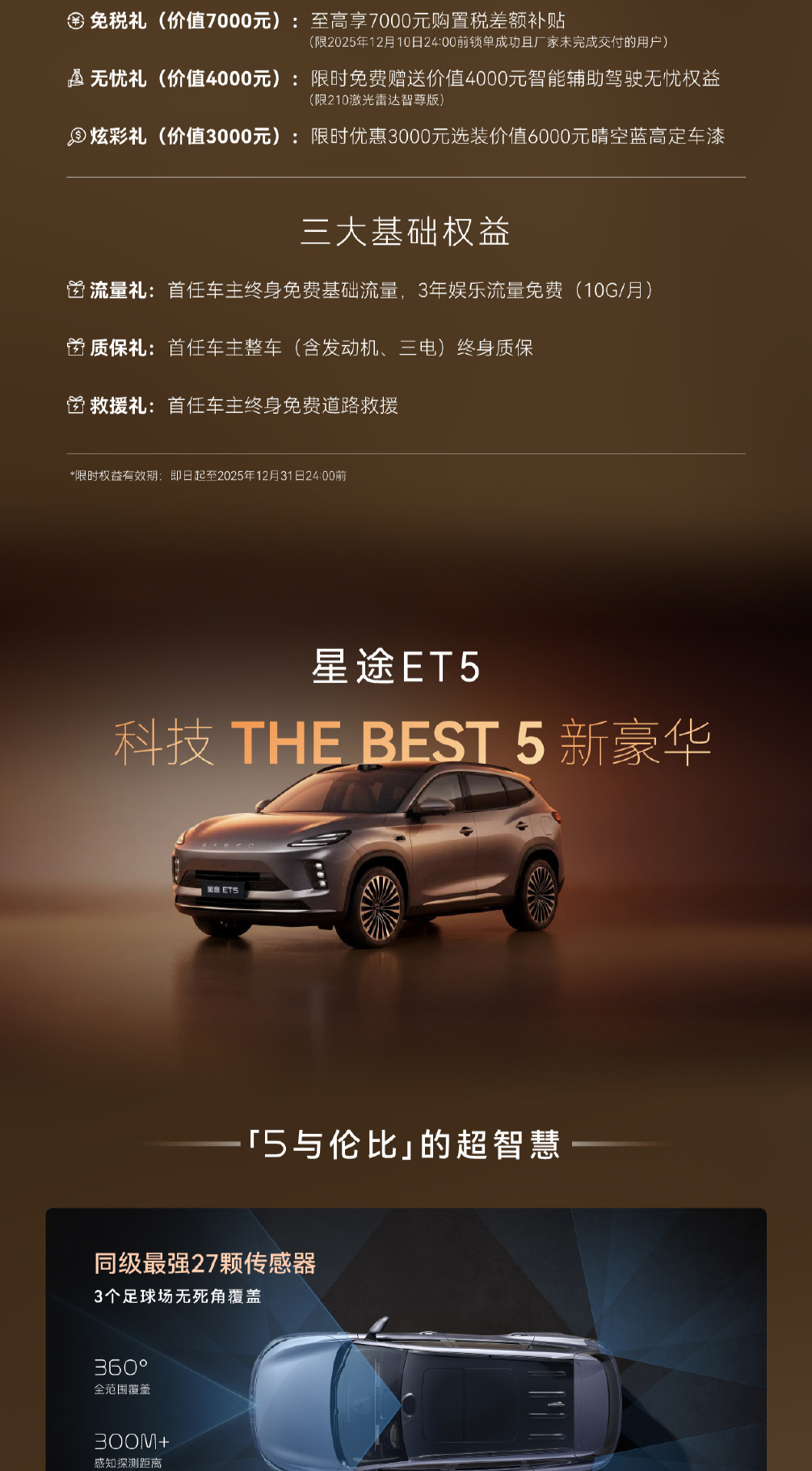 其他配置部分,星途 ET5 标配有前排双安全气囊、前排座椅侧安全气囊、前排侧气帘、自动驻车、哨兵模式、540 度全景影像、胎压监测、主驾座椅 6 向电动调节、皮质方向盘、可开启全景天窗、电动尾门、驾驶模式选择等配置;高配车型还提供主驾膝部气囊、主驾座椅加热 / 通风 / 按摩、副驾座椅 6 向电动调节 / 加热 / 通风 / 按摩、人脸识别等配置。