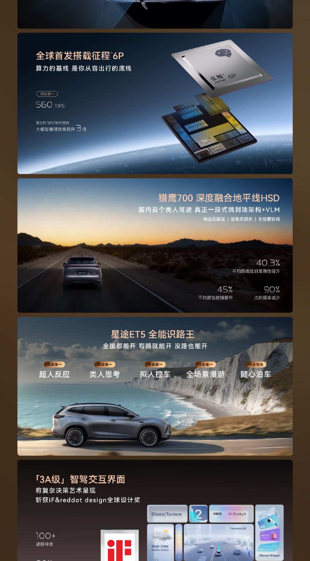 另外,这款汽车是奇瑞集团与地平线合作的首款合作车型,搭载猎鹰 700 辅助驾驶系统(同时提供猎鹰 200 辅助驾驶系统),首搭地平线 HSD、征程 6P 辅助驾驶方案,拥有包含 1 颗激光雷达在内的 27 个高精传感器(1 个激光雷达 +12 个超声波雷达 +3 个毫米波雷达等),拥有基于一段式端到端架构和强化学习能力,可实现 NEP 高速辅助驾驶和 NEP 城市辅助驾驶等功能。