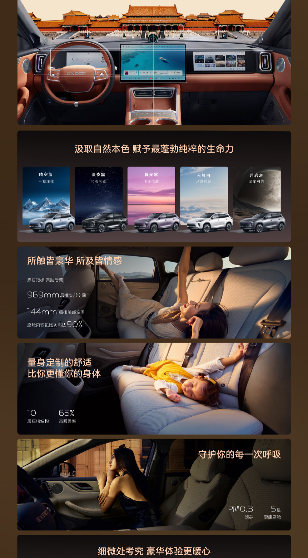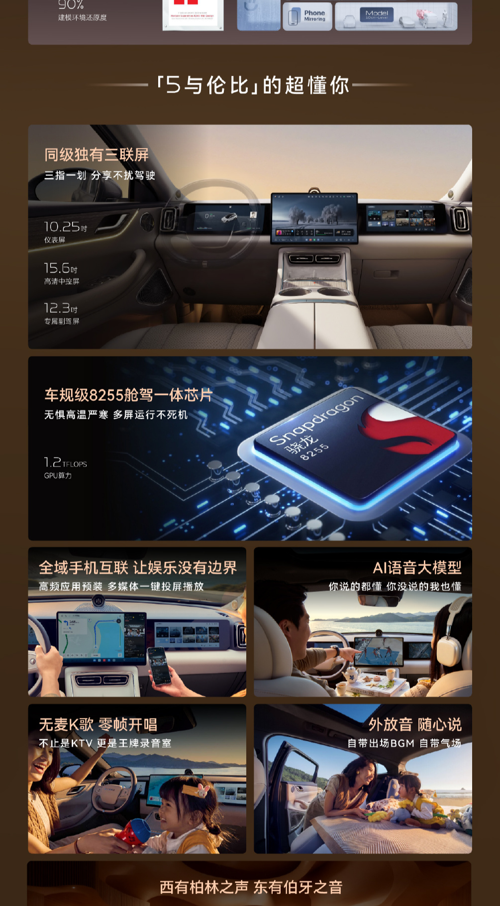 内饰方面,这款汽车的车内设计较为简洁,暖阳米和沐光橙两种配色,配备双辐式多功能方向盘,两侧具有触控按键和滚轮,换挡采用怀挡式机构,中控下方拥有手机无线充电板、杯托、对开扶手箱等,新车还搭载高通骁龙 8255 座舱芯片,配备有 15.6 英寸中控屏、10.25 英寸仪表屏以及 12.3 英寸副驾屏(均可触控)。