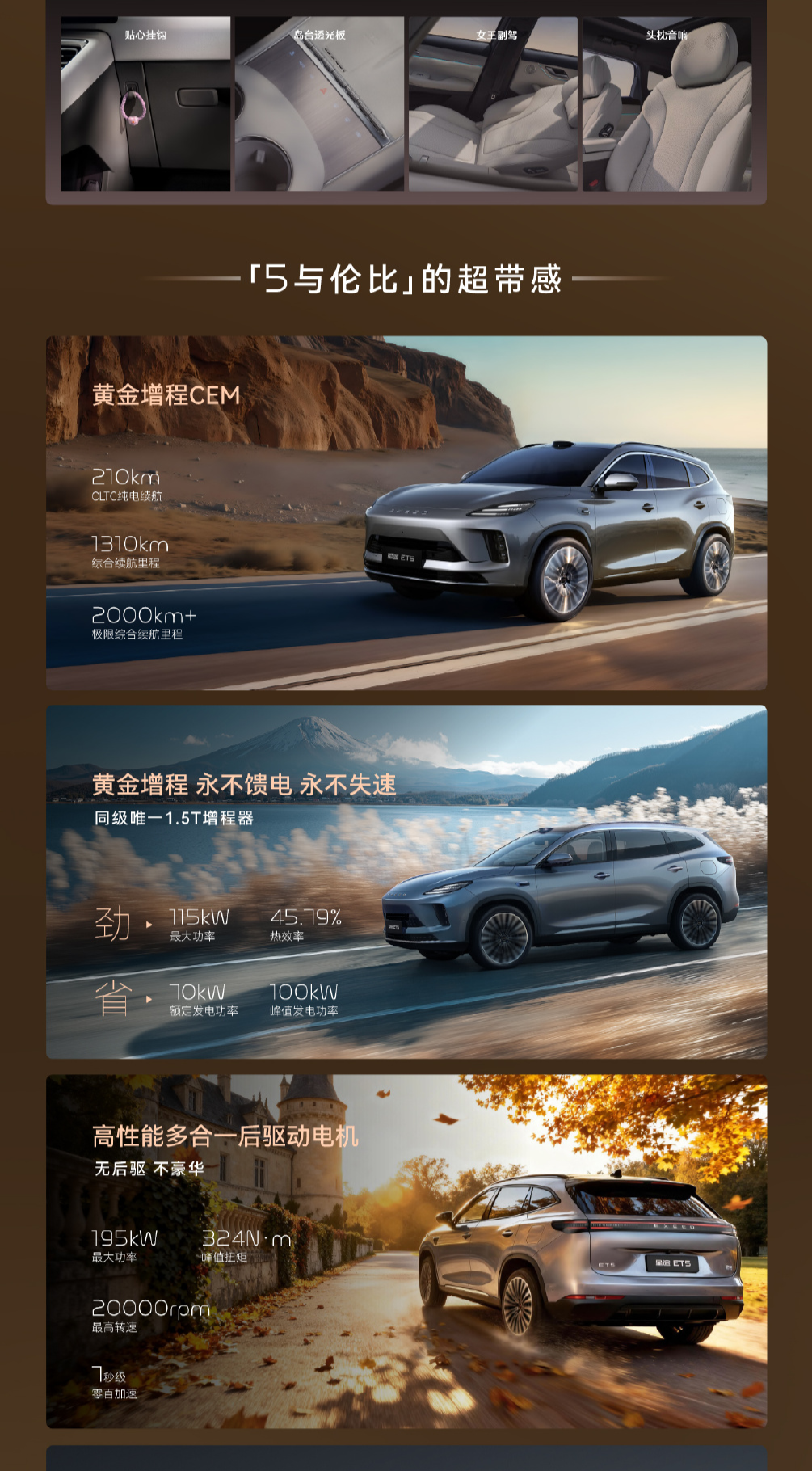 这款汽车配备增程式动力系统,搭载 SQRH4J15 的 1.5T 增程器,最大功率 115 千瓦,配有容量为 32.66 千瓦时的磷酸铁锂电池组,电机功率为 195kW,最大扭矩 324 牛・米,零百加速 7.8 秒,CLTC 纯电续航里程可达 205 公里 / 综合续航里程为 1310 公里,AEB 紧急制动系统支持最高 135km/h 刹停。