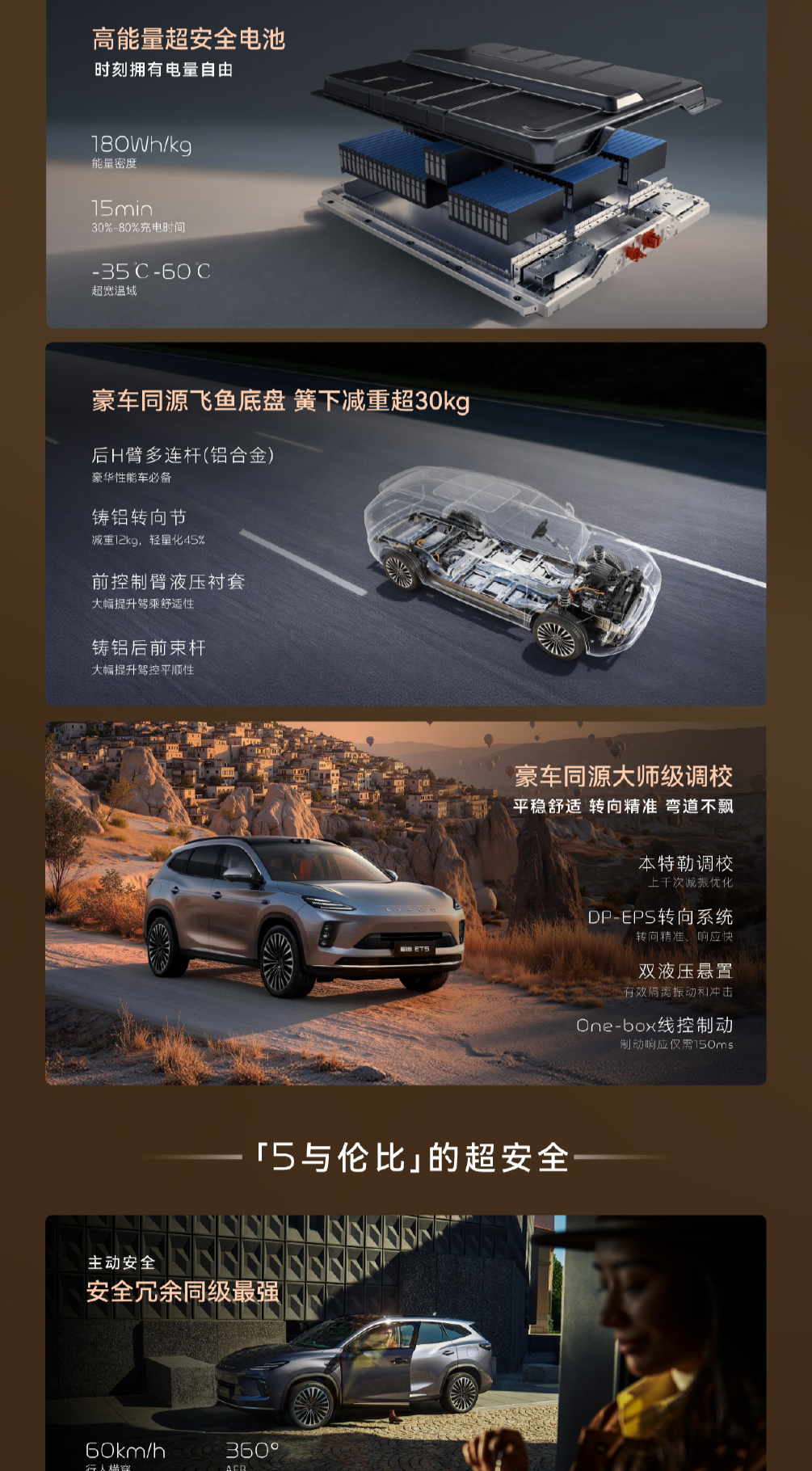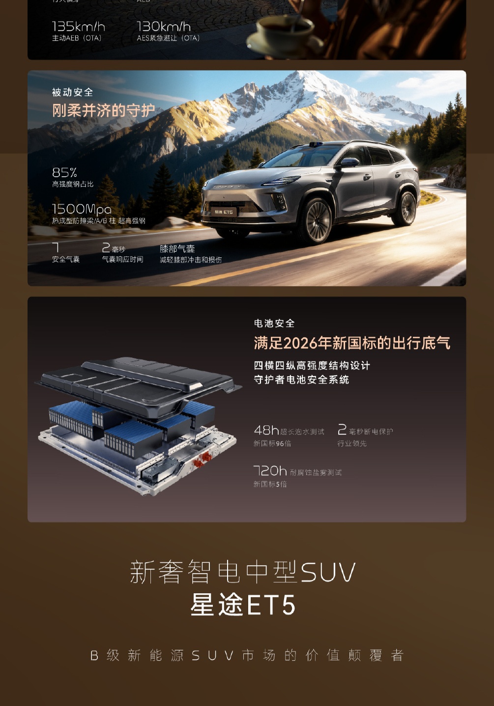 星途 ET5 搭载同级唯一满足 2026 版国标的电池,历经 41 项安全碰撞测试,扛得住相当于 5 头 20 吨大象重量的 200KN 挤压实测,燃烧测试 105 秒不起火不爆炸,还具备行业独有的碰撞 2 毫秒高压断电功能,超国标要求。