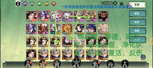 ,可以选择更多UR角色,如敖丙、孟婆和魔童。敖丙可代替冰女,提供全体破甲、减速、冰冻真伤和队友增益;孟婆提供暴击和复活能力;魔童哪吒用于压血线。配置思路如下: