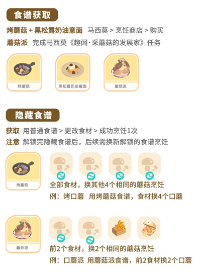 小编今天给大家带来的心动小镇的蘑菇食谱大全超实用,能帮你搞清楚各种蘑菇能做成什么菜、需要搭配哪些食材,省得你浪费时间去瞎试,直接照着做就能解锁新料理、完成订单,还能提升厨艺等级,总之非常方便。另外还有隐藏食谱的解锁方法哦,怎么样看到这里是不是超级心动啦?那有需要的小伙伴快点过来看看吧,保证让你轻轻松松解锁蘑菇食谱再也不用费心去尝试啦~