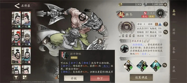 4. 典韦:肉盾输出,可切换增伤回血或减伤分摊伤害,掉血减伤给对方减全属性,天赋反击后追击目标,副将带普攻伤害降低但可攻击两次。