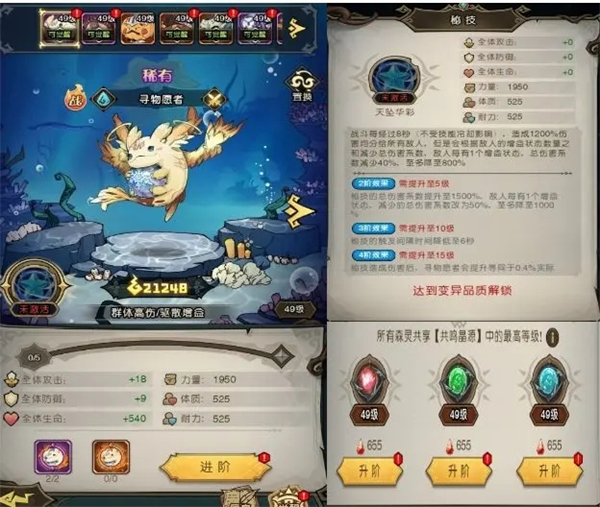 森灵提升靠觉醒和共鸣晶源,变异森灵解锁秘技,觉醒材料通过抽卡获取,共鸣晶源材料来自密塔之林、主线副本和唤灵之森。