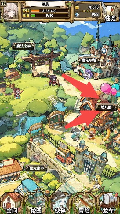 4.在通关第二章之后基本上就陆续解锁其他各种挂机得资源的模式了魔法学院,星光集市,魔法之森以及巡逻,前仨个模式前期基本上升个一级左右就够了,因为金币紧缺,这几个模式都是随便拿几个角色放上去挂着就行不用怎么管。