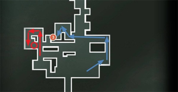 随后迅速移动至右下角蓝色箭头区域,绕路前往标识【3】位置。