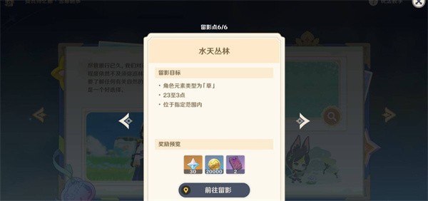 1、打开活动页面,点击【查看详情】,选择【水天丛林】→【前往留影】。