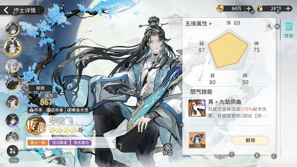 华云飞:对敌方全体造成576%秘术伤害:并使其受到2回合【凤火】,【凤火】:每次出手前有100%概率受到自身10%最大血量的伤害,每次伤害不超过施法者最大血的20%。
