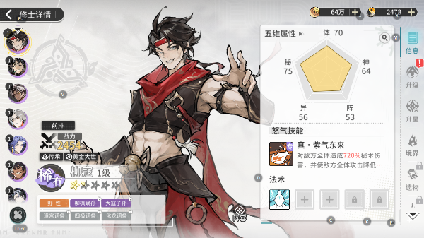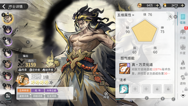 王腾:对敌方竖排造成1287%秘术伤害并回复该次造成伤害30%的气血,若自身存在乱古状态,则额外回复自身1点怒气。