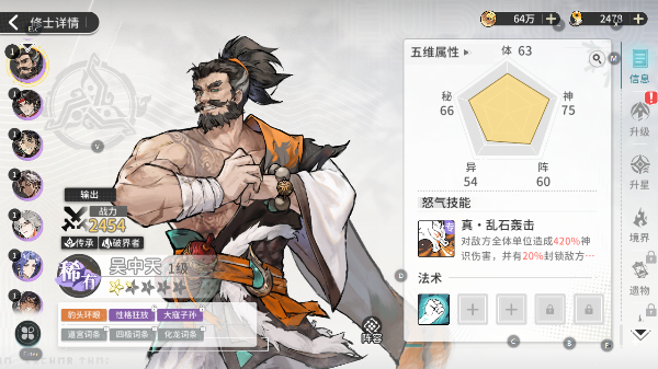 吴中天:对敌方全体单位造成420%神识伤害,并有20%封锁敌方1回合,额外消耗自身10%当前气血,记升15%封锁概率。