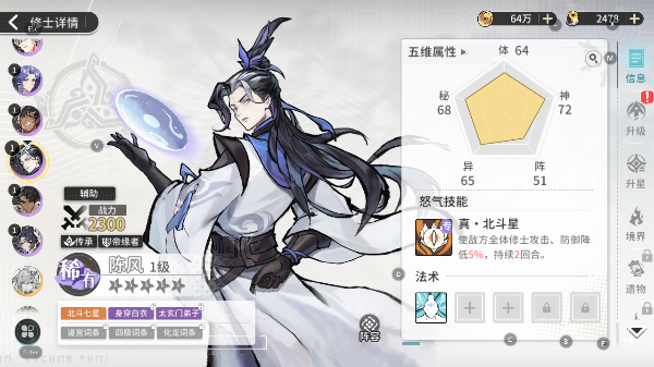 陈风:使敌方全体修士攻击、防御降低5%,持续2回合。