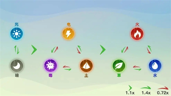 光、暗克制电、毒、土,造成1.1倍伤害,电、毒、土克制火、草、水,同样造成1.1倍伤害。