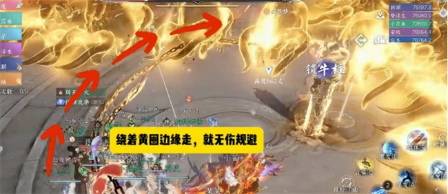 应对方法:把捡到的锁牛柱立在场地中间,会形成一圈减速带。在BOSS召唤黄牛冲锋时我们躲在黄圈后面,待黄牛被减速带拉开距离后,我们绕着这个黄圈走即可无伤规避黄牛冲锋。*后续殷万敌还会同时召唤横竖两轮黄牛冲锋,处理方式一样,绕着黄圈边缘走即可。