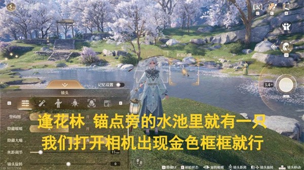 传送至【逢花林】锚点,旁边的水池中有折扇白鹭。打开相机对准白鹭,取景框变金即可完成。