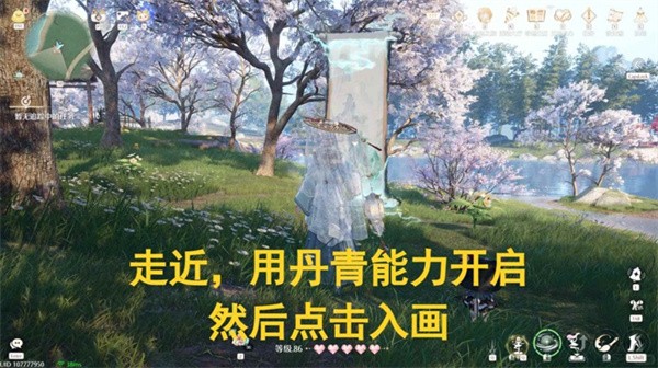 若墨池附近画轴未开启:传送【奉龙塔】锚点 → 左转前进,找到画轴并用丹青能力开启 → 选择“入画”进入丹青之境 → 左转进入亭子最深处拍摄。
