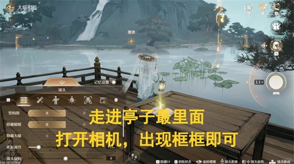 传送至【奇境画轴·丹青之境望龙亭】锚点 → 右转前往瀑布边拍摄。若无法触发金框,可左转跳到下方石块,调整相机距离至远景后拍摄。