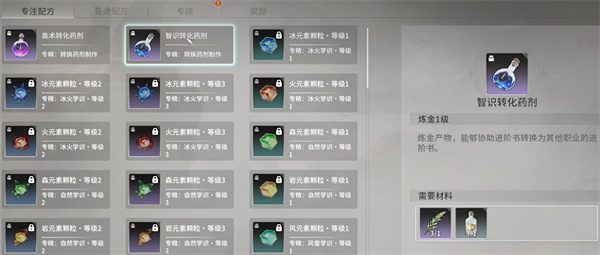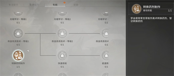 首先,想要使用转换药剂,你需要在专精界面解锁该制作配方。这一步相对简单,只需要消耗少量的专精技能点。如果你的专精点不够,可以点击界面下方的重置按钮进行调整。值得注意的是,每个角色有两次免费的重置机会,但每次重置时,你只能调整三个生活技能的专精,所以要谨慎操作。