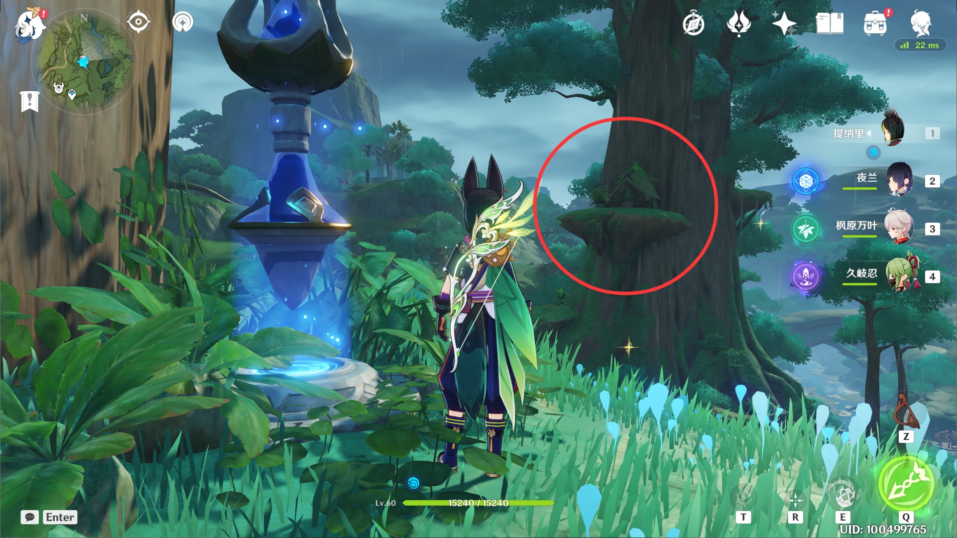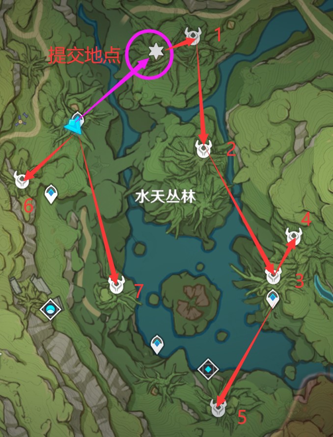 我们从水天丛林西北方向这个传送点出发,通过四叶印飞到星星标记的地方,也就是下图: