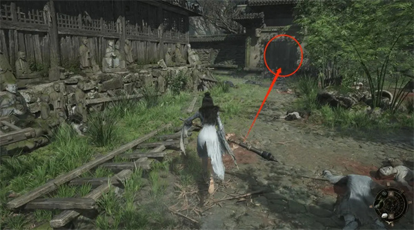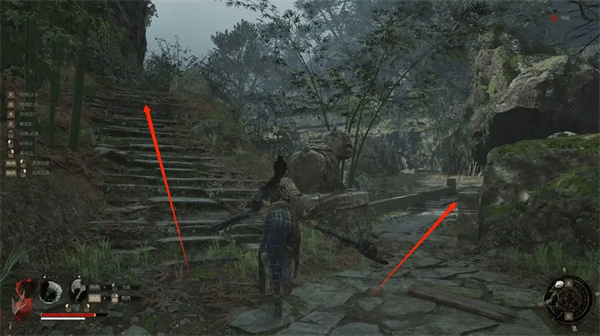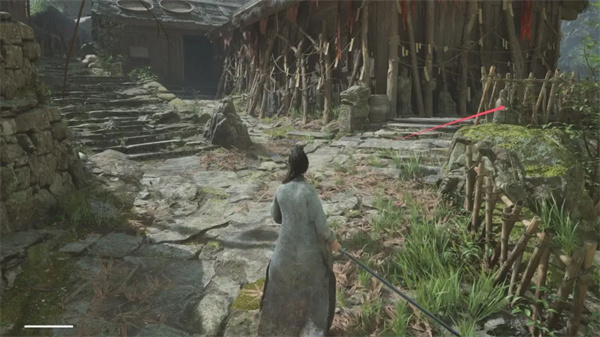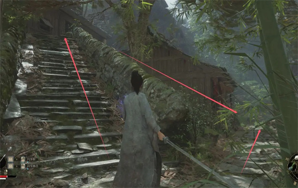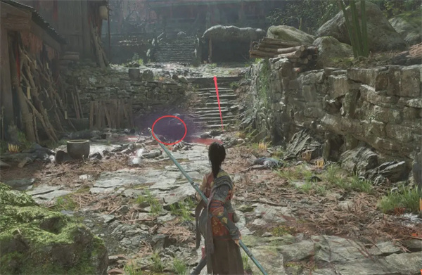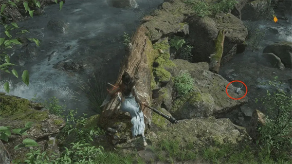 沿着路径继续前进,坡道上你会遇到一只竹笋。锁定并跑过去攻击竹笋即可收集它,之后可以交给熊猫商人换取商品。如果你错过了,可以在神龛处“入梦”后,竹笋会重新刷出来。前方河边的木桥处,右边可以捡到【萌发的赤汞*1】。