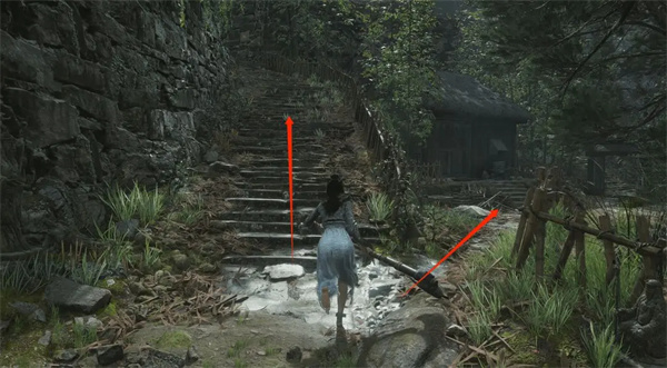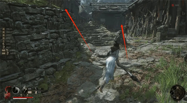 在台阶顶部的房屋前,你可以拾取【掷杯筊*3】。和屋内的人对话后,你将获得【乌黑的药丸*1】。继续前行,右拐可以先探索一下前方的屋子,里面拾取到【蒸面兔*2】。与屋内的人对话后,还能获得【乌黑的药丸*1】。继续往前,再沿木楼梯上楼,屋内有【乌黑的药丸*1】。