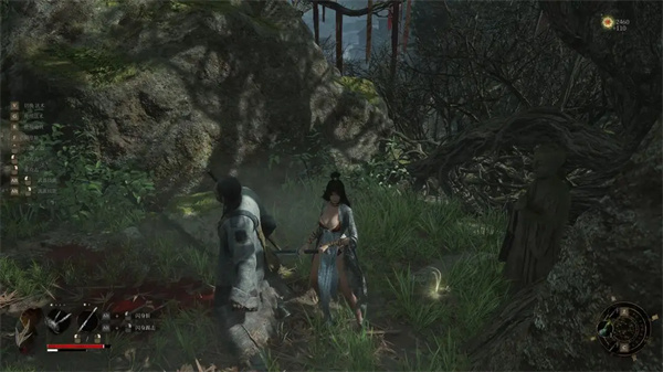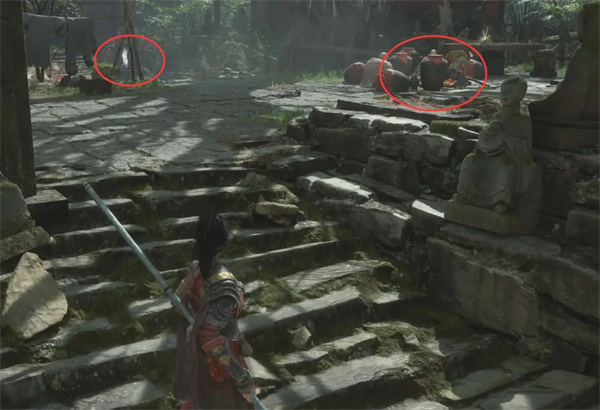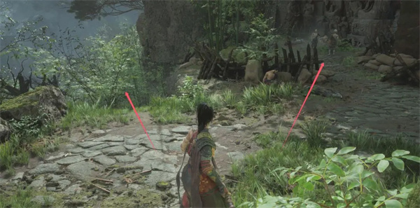 。继续前行时,注意会有绊雷。踩到带铜钱的雷区会发出声音,引来敌人的注意。而绳索雷则会直接引爆,造成大量伤害。击败附近的僧人后,可以在地上拾取【龙凤玉佩】