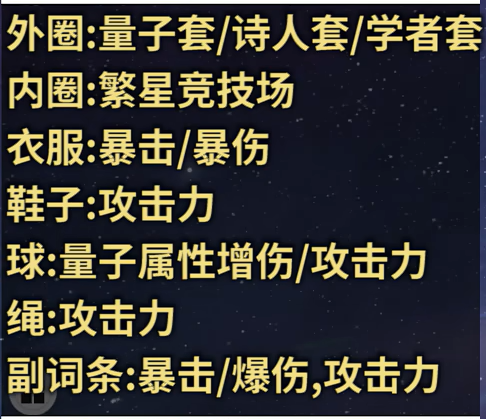 主词条方面,暴击/爆伤衣服、攻击鞋、量子球、攻击绳