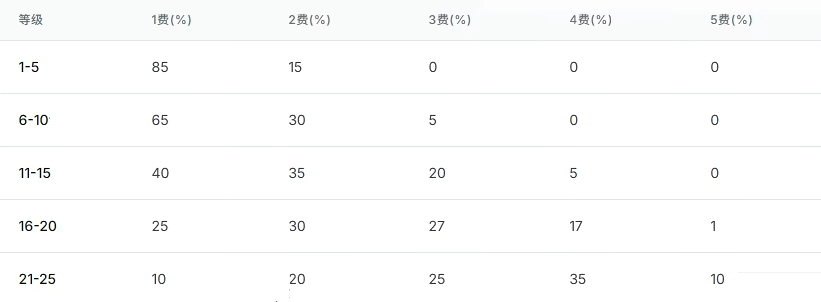 棋子刷新概率:为 25 级 PVE 适配,有相应概率分段表。