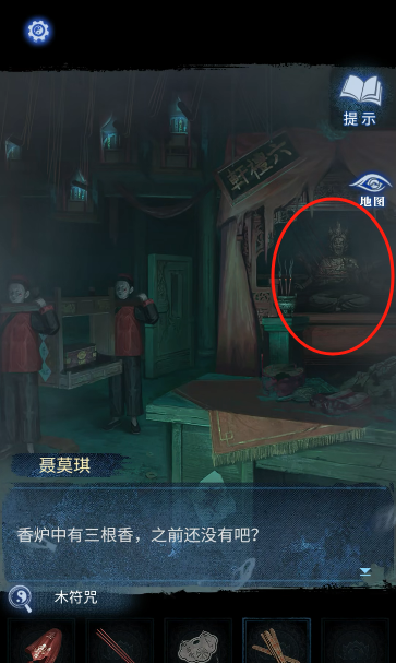 前往六礼轩,点击右侧这个石像,将木符咒插入到石像头上就可以获得三根香