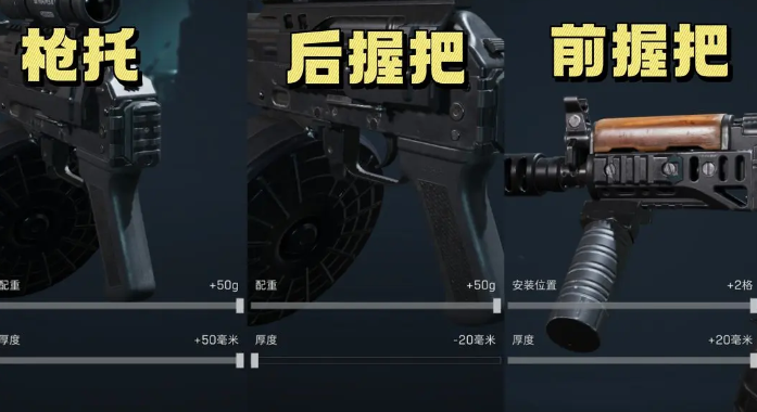 其他的方面枪口我们选择DTK制退器,前握把我们选择X25U斜握把,后握把选择实用AK后握把,瞄准镜就随便来个镭射,保证高机动,枪托我们选择AK枪托尾盖。