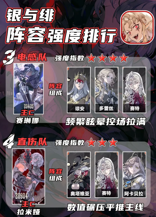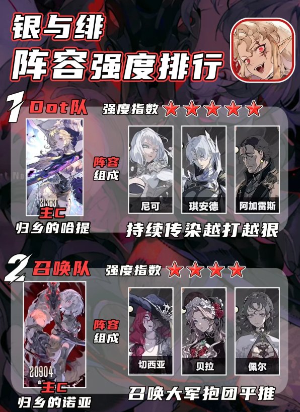 家人们!入坑必看的银与绯阵容强度排行给你们安排上了,把这个吃透了可以帮你明确版本强势角色、优化阵容搭配,让输出核心与辅助角色形成良好协同,最重要的是可以根据这个合理分配资源,重点培养强力角色,争取不浪费一丁点物资!这套阵容同时针对英灵剑冢、竞技场等不同玩法,具体的家人们看完然后自己去游戏上阵试试吧!