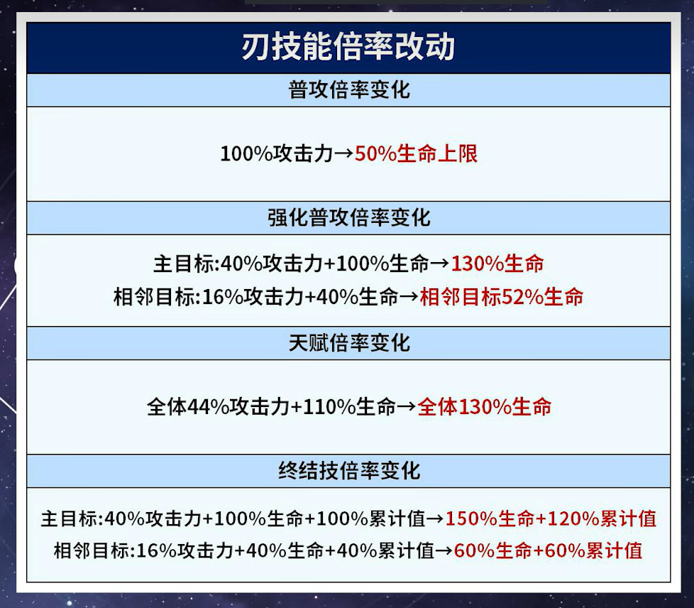 刃的当前生命值百分比小于等于生命上限的50%时,受到治疗时的回复量提高20%。→刃施放终结技清空的累计已损失生命值改为50%。