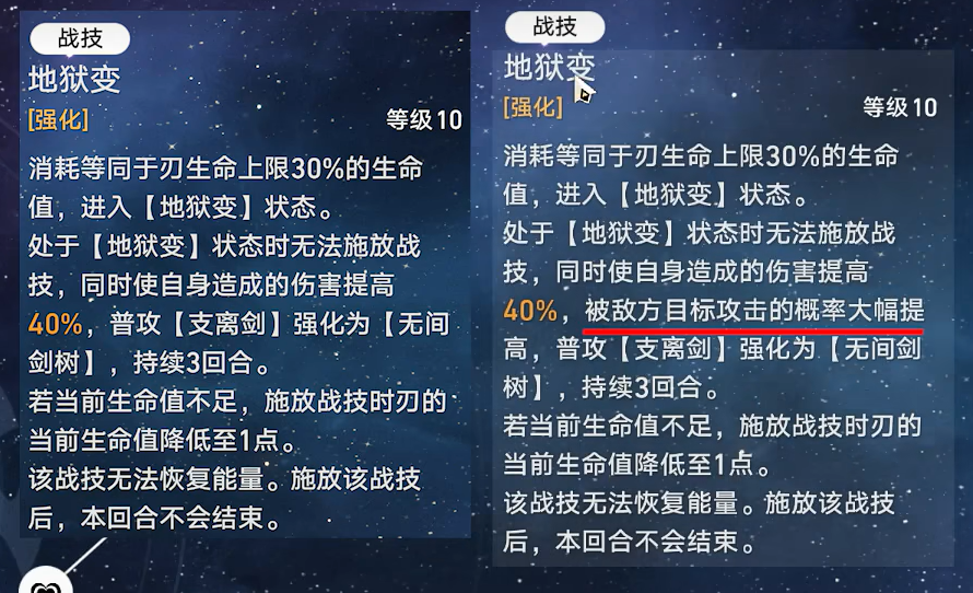 处于【地狱变】状态时无法施放战技,同时使自身造成的伤害提高40%,被敌方目标攻击的概率大幅提高,普攻【支离剑】强化为【无间剑树】,持续3回合。