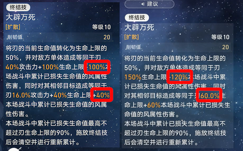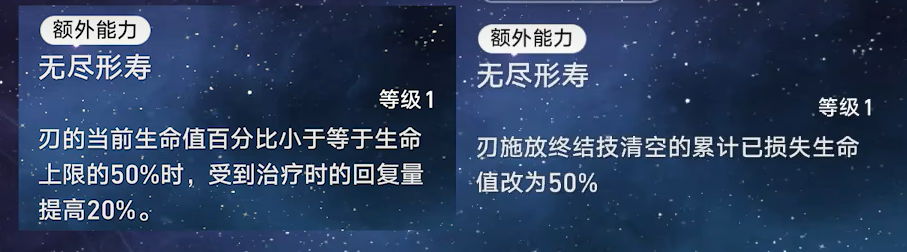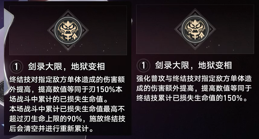 终结技对指定敌方单体造成的伤害额外提高,提高数值等同于刃150%本场战斗中累计的已损失生命值。本场战斗中累计已损失生命值最高不超过刃生命上限的90%,施放终结技后会清空并进行重新累计。→强化普攻与终结技对指定敌方单体造成的伤害额外提高,提高数值等同于终结技累计已损失生命值的150%。
