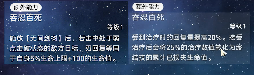 施放【无间剑树】后,若击中处于弱点击破状态的敌方目标,刃回复等同于自身5%生命上限+100的生命值。→受到治疗时的回复量提高20%。接受治疗后会将25%的治疗数值转化为终结技的累计已损失生命值。