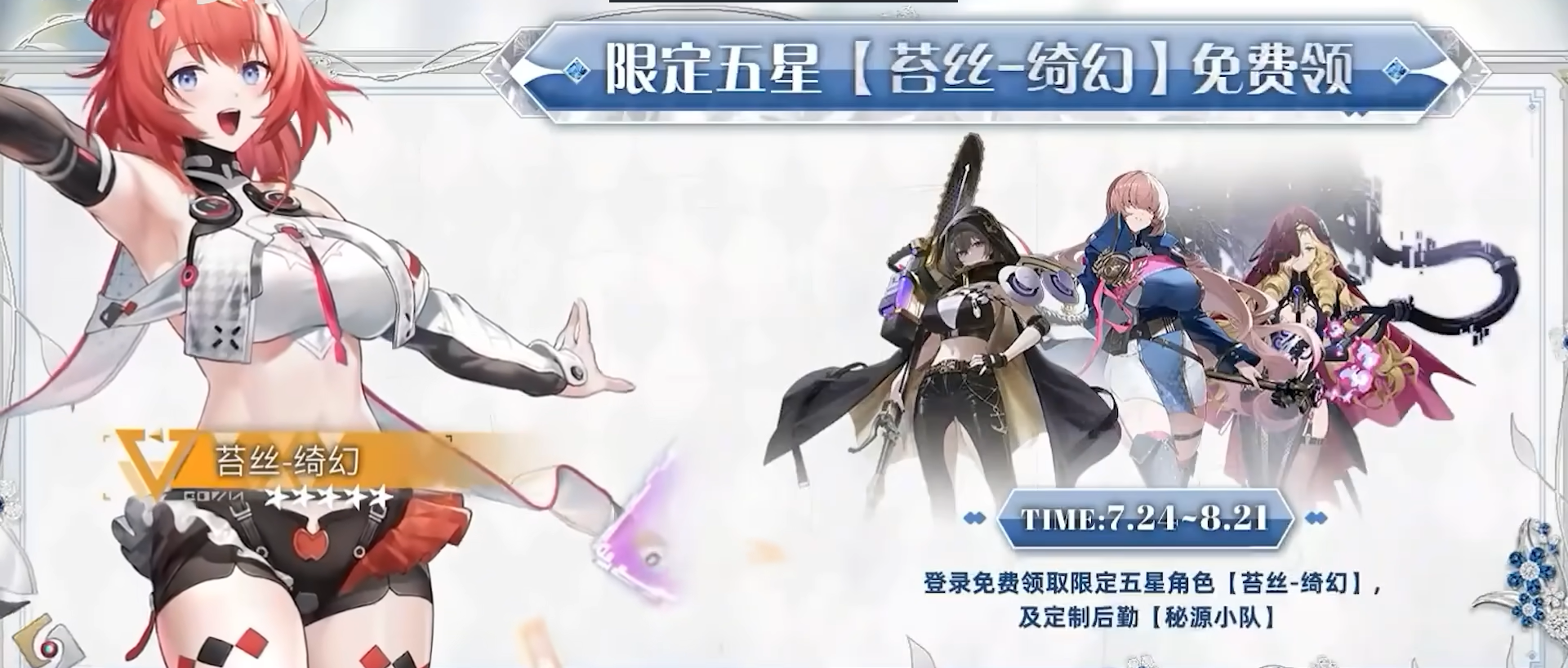 登录免费领取限定五星角色【苔丝-绮幻】,及定制后勤【秘源小队】