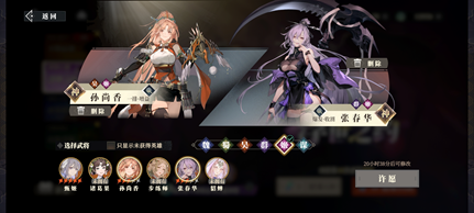 这次带来一套新手纯女团阵容,浮世之约心愿武将选孙尚香和张春华,宿命相逢心愿选巾帼阵营。优先养成孙尚香和张春华一火开突破技,然后张春华五火,再孙尚香五火。张春华爆发强,五火效果搭配她的收割者职业让收割收益最大化。注意中毒,灼烧等异常状态都算减益,目前能增加减益命中的地方很少,孙尚香突破技五火效果丹翎提升100%减益抵抗,可以做到基本不中减益。